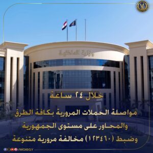 وأسفرت الحملات المرورية خلال 24 ساعة، عن ضبط 123,460 من المخالفات المرورية المتنوعة، أبرزها السير بدون تراخيص، تجاوز السرعة المقررة، الوقوف العشوائي، التحدث في الهاتف المحمول أثناء القيادة، ومخالفة شروط التراخيص.