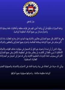 أصدر نادي السيارات والرحلات المصري بيانا أكد فيه أن رياضة السيارات، شأنها شأن أي رياضة أخرى، تقوم على قواعد منظمة وأخلاقيات عامة وسلوك لائق قائم على الاحترام المتبادل بين جميع أطراف المنظومة الرياضية.