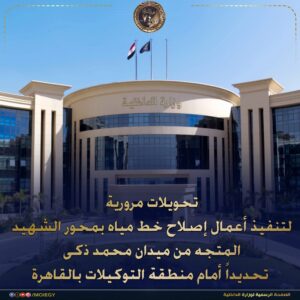 أعلنت الإدارة العامة لمرور القاهرة عن تنفيذ تحويلات مرورية مؤقتة على محور الشهيد في الاتجاه المؤدي إلى ميدان محمد ذكي، وذلك بسبب أعمال إصلاح خط مياه.