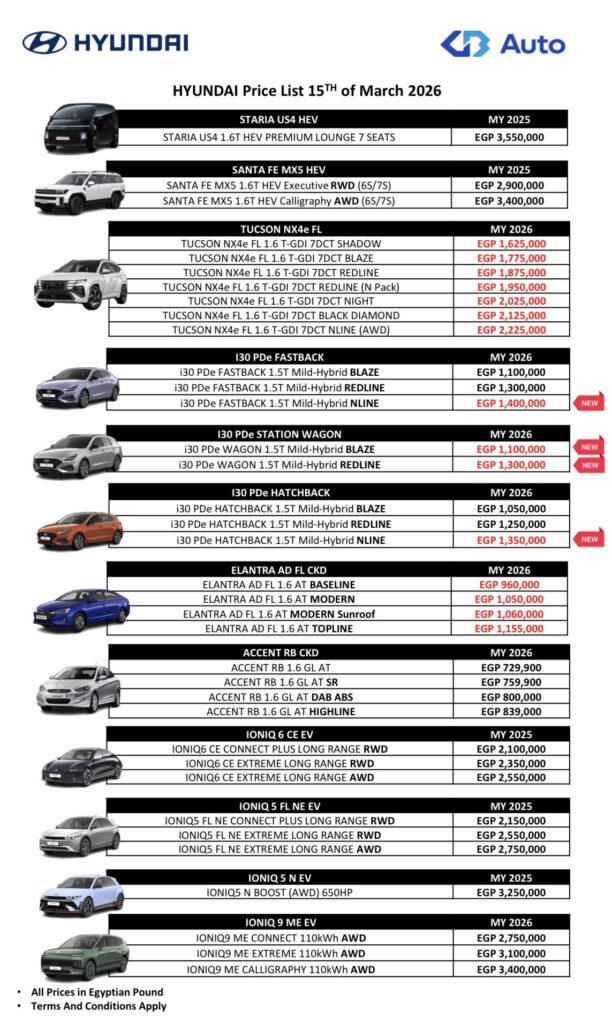 في أقل من أسبوعين؛ أقرت شركة جي بي أوتو، وكيل علامة هيونداي في مصر، زيادة سعرية جديدة على بعض سيارات هيونداي 2026 شملت طرازات توسان، و إلنترا AD التي سبق أن شهدت زيادة في الرابع من الشهر الجاري. كما شهدت القائمة المعلنة إضافة فئات جديدة للسيارة i30.