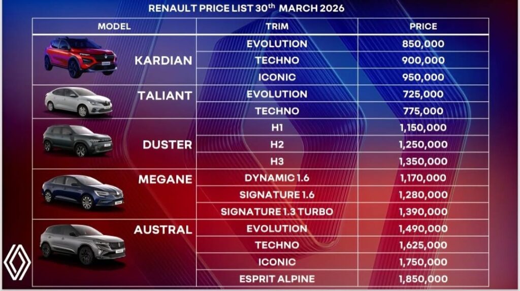 وجاءت الزيادة الأكبر من نصيب طراز داستر بقيمة 110 آلاف جنيه؛ ليبدأ سعر الفئة الأولى منها من مليون و 150 ألف جنيه. بينما جاءت القائمة الكاملة لأسعار سيارات رينو على النحو التالي:
